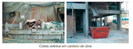 - 6º Passo: desenvolvimento e documentação dos procedimentos adotados para seleção, acondicionamento, despacho e retirada dos resíduos da obra. Providenciar recipientes para acondicionamento dos materiais a serem segregados. Em cada pavimento, quando for o caso, deve-se ter recipiente para coleta seletiva, identificado conforme o material a ser selecionado. No andar térreo, é importante a instalação de baias para acumular os resíduos coletados. A normalização do padrão de cores para os resíduos é dada pela Resolução Conama 275/2001.