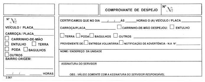 A prefeitura poderá elaborar um sistema de controle, conforme modelo proposto abaixo, visando a supervisionar a coleta e a disposição do entulho por cada carroceiro. Caberá, ainda, à prefeitura o cadastramento e o acompanhamento das tarefas executadas pelo carroceiro. O pequeno gerador também deverá participar da supervisão da disposição adequada do entulho.