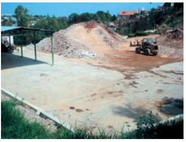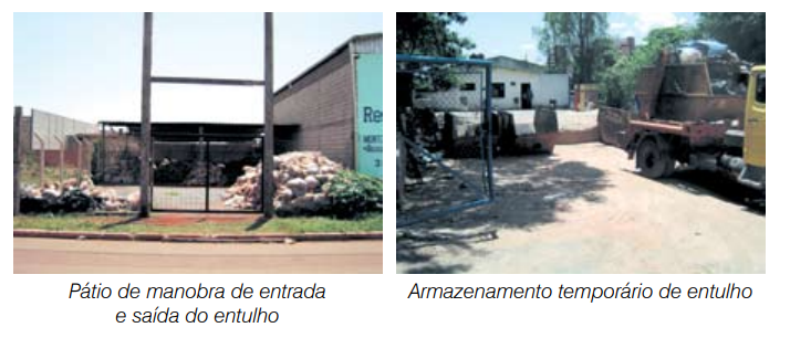 Pátio para estocagem dos resíduos de construção civil: o entulho deve ser segregado na fonte geradora, sendo selecionado os resíduos não contaminados, que serão destinados à reciclagem como fragmentos de blocos cerâmicos, concreto, argamassa, brita, azulejos, telhas. Ressalta-se que a heterogeneidade dos componentes do entulho pode alterar a sua classificação, pois apresentam dependência direta com as obras que lhe deram origem, podendo apresentar elementos que o tornem não inerte ou, até mesmo, perigosos. Os entulhos recebidos que ultrapassam o limite aceitável de contaminação são encaminhados diretamente para o aterro sanitário.
