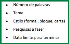 A primeira coisa que deve fazer é um esqueleto do texto que pretende escrever, com algumas notas que identificarão o que irá ser escrito. Por exemplo: