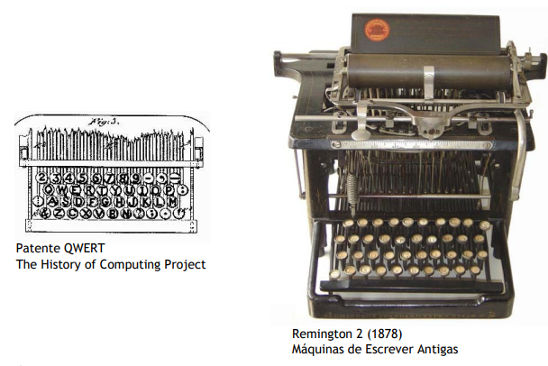 O modelo QUERTY foi patenteado em 1868 por Christopher Sholes. O desenho tinha como principal objectivo evitar que os braços das letras ficassem encravados. Apesar de ineficiente e confuso, continua a manter-se em uso. Outros modelos: AZERTY, o DVORAK ou o HCESAR.