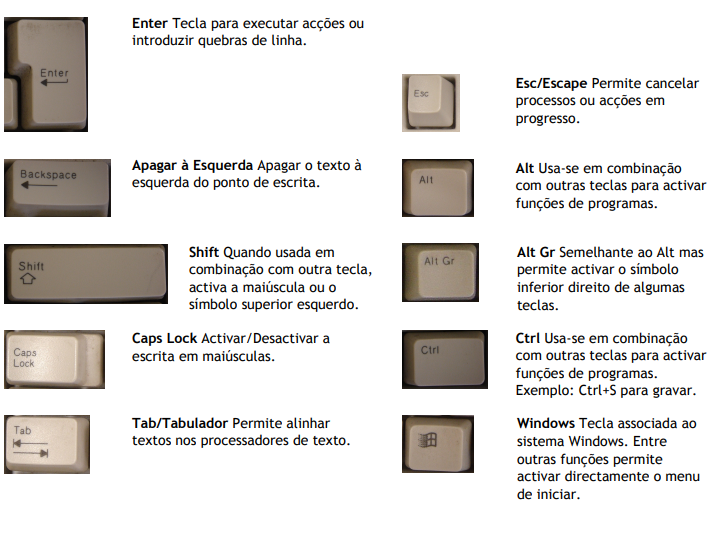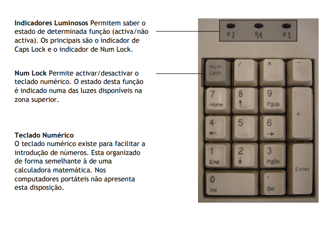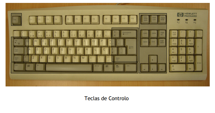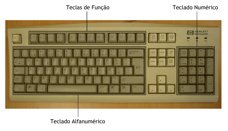 Os teclados são essencialmente formados por um arranjo de botões retangulares, ou quase retangulares, denominados teclas. Cada tecla tem um ou mais caracteres impressos ou gravados em baixo relevo em sua face superior, sendo que, aproximadamente, cinqüenta por cento das teclas produzem letras, números ou sinais (denominados caracteres). Entretanto, em alguns casos, o ato de produzir determinados símbolos requer que duas ou mais teclas sejam pressionadas simultaneamente ou em seqüência. Outras teclas não produzem símbolo algum; todavia, afetam o modo como o microcomputador opera ou agem sobre o próprio teclado.
