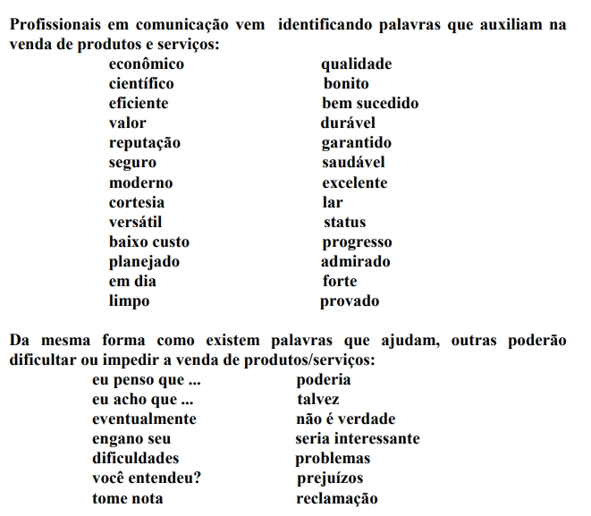 O vocabulário usado deve ser do conhecimento do receptor. Use palavras e termos que o cliente conheça ou ele não compreenderá sua mensagem. O publicitário Duda Mendonça afirma: “comunicação não é o que a gente fala; é o que as pessoas entendem”. Caso a mensagem exista possibilidade de mal entendido (ruído de comunicação), este haverá!