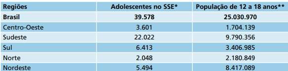 A realidade dos adolescentes em conflito com a lei não é diferente dos dados ora apresentados. Estes também têm sido submetidos a situações de vulnerabilidade, o que demanda o desenvolvimento de política de atendimento integrada com as diferentes políticas e sistemas dentro de uma rede integrada de atendimento, e, sobretudo, dar efetividade ao Sistema de Garantia de Direitos. O Levantamento estatístico da Subsecretaria de Promoção dos Direitos da Criança e do Adolescente da Secretaria Especial dos Direitos Humanos (Murad, 2004) identificou que existiam no Brasil cerca de 39.578 adolescentes no sistema socioeducativo.12 Este quantitativo representava 0,2% (zero vírgula dois por cento) do total de adolescentes na idade de 12 a 18 anos existentes no Brasil (Tabela 1). Ainda em relação e esse levantamento estatístico, 70% (setenta por cento), ou seja, 27.763 do total de adolescentes no Sistema Socioeducativo se encontravam em cumprimento de medidas socioeducativas em meio aberto (liberdade assistida e prestação de serviço à comunidade). Tabela 1 - Adolescentes segundo o sistema socioeducativo e a população total de adolescentes de 12 a 18 anos - por Região: