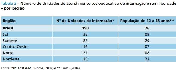 É longa a tradição assistencial-repressiva no âmbito do atendimento à criança e ao adolescente, principalmente para aqueles em conflito com a lei. Segundo dados do IPEA/DCA-MJ (Rocha, 2002), existiam 190 Unidades de atendimento socioeducativo que executavam a medida de internação e 76 Unidades de semiliberdade (Fuchs, 2004), (Tabela 2).