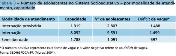 Conforme os dados de Murad (2004), existiam 13.489 infanto-adolescentes privados de liberdade (internação provisória, internação e semiliberdade) e um déficit de vagas para a internação e internação provisória de 1499 e 1488, respectivamente (Tabela 3). Já a semiliberdade apresentava um excedente de vagas. Mesmo sabendo que na aplicação da medida socioeducativa se levará em conta a capacidade do adolescente cumprir a medida socioeducativa, as circunstâncias e a gravidade da infração. Ao se analisar esse dado referente à capacidade, verifica-se que 53% (cinqüenta e três por cento) deste déficit da internação poderia ser resolvido com as vagas excedentes das Unidades de semiliberdade (Fuchs, 2004).