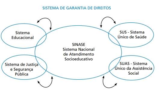 Ao enumerar direitos, estabelecer princípios e diretrizes da política de atendimento, definir competências e atribuições gerais e dispor sobre os procedimentos judiciais que envolvem crianças e adolescentes, a Constituição Federal e o Estatuto da Criança e do Adolescente instalaram um sistema de “proteção geral de direitos” de crianças e adolescentes cujo intuito é a efetiva implementação da Doutrina da Proteção Integral, denominado Sistema de Garantia de Direitos (SGD). Nele incluem-se princípios e normas que regem a política de atenção a crianças e adolescentes, cujas ações são promovidas pelo Poder Público em suas 03 esferas (União, Estados, Distrito Federal e Municípios), pelos 03 Poderes (Executivo, Legislativo e Judiciário) e pela sociedade civil, sob três eixos: Promoção, Defesa e Controle Social. A opção pela forma de Sistema tem como finalidade melhor ordenar as várias questões que gravitam em torno da temática, reduzindo-se, assim, a complexidade inerente ao atendimento aos direitos desse público. No interior do SGD existem diversos subsistemas que tratam, de forma especial, de situações peculiares. Dentre outros subsistemas, incluem-se aqueles que regem as políticas sociais básicas, de assistência social, de proteção especial e de justiça voltados ao atendimento de crianças e adolescentes. É nesse contexto que se insere o atendimento ao adolescente em conflito com a lei desde o processo de apuração, aplicação e execução de medida socioeducativa. Pode-se dizer que a reunião de suas regras e critérios, de forma ordenada e que almeje reduzir as complexidades de atuação dos atores sociais envolvidos, possibilita a construção de um subsistema que, inserindo-se no SGD, atua sobre esse ambiente específico relacionado a esses adolescentes. A esse subsistema específico dá-se o nome de Sistema Nacional de Atendimento Socioeducativo (SINASE), o qual se comunica e sofre interferência dos demais subsistemas internos ao Sistema de Garantia de Direitos (tais como Saúde, Educação, Assistência Social, Justiça e Segurança Pública).