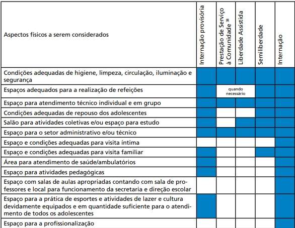 Tabela 3 – Número de adolescentes no Sistema Socioeducativo – por modalidade de atendimento, capacidade As Regras Mínimas das Nações Unidas para a Proteção de Jovens Privados de Liberdade estabelece o princípio - ratificado pelo ECA (artigos 94 e 124) - que o espaço físico das Unidades de privação de liberdade deve assegurar os requisitos de saúde e dignidade humana. Entretanto, 71% (setenta e um por cento) das direções das entidades e/ou programas de atendimento socioeducativo de internação pesquisadas em 2002 (Rocha, 2002) afirmaram que o ambiente físico dessas Unidades não é adequado às necessidades da proposta pedagógica estabelecida pelo ECA. As inadequações variavam desde a inexistência de espaços para atividades esportivas e de convivência, até as péssimas condições de manutenção e limpeza. Outras Unidades, porém, mesmo dispondo de equipamentos para atividades coletivas, não eram utilizadas. Muitas Unidades funcionavam em prédios adaptados e algumas eram antigas prisões. Várias dessas se encontravam com problemas de superlotação com registro de até cinco adolescentes em quartos que possuíam capacidade individual e os quartos coletivos abrigavam até o dobro de sua capacidade. (Rocha, 2002, p.70-71). A auditoria realizada pelo Tribunal de Contas da União (TCU) apontou desafios para o programa da SEDH de reinserção do adolescente em conflito com a lei, que devem ser agregados na análise situacional do atendimento socioeducativo, bem como para a política de atendimento socioeducativa. Entre eles, destacam-se: