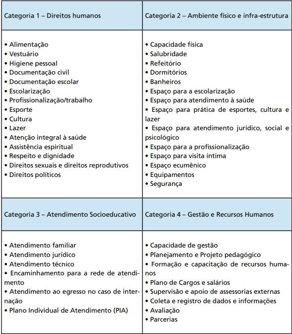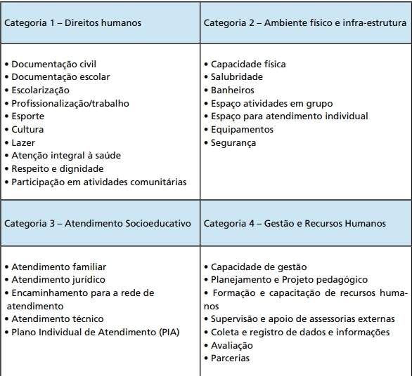 Categorias e indicadores de qualidade dos programas de atendimento socioeducativos No quadro abaixo estão indicadas as categorias e indicadores principais para a avaliação da qualidade dos programas socioeducativos.
