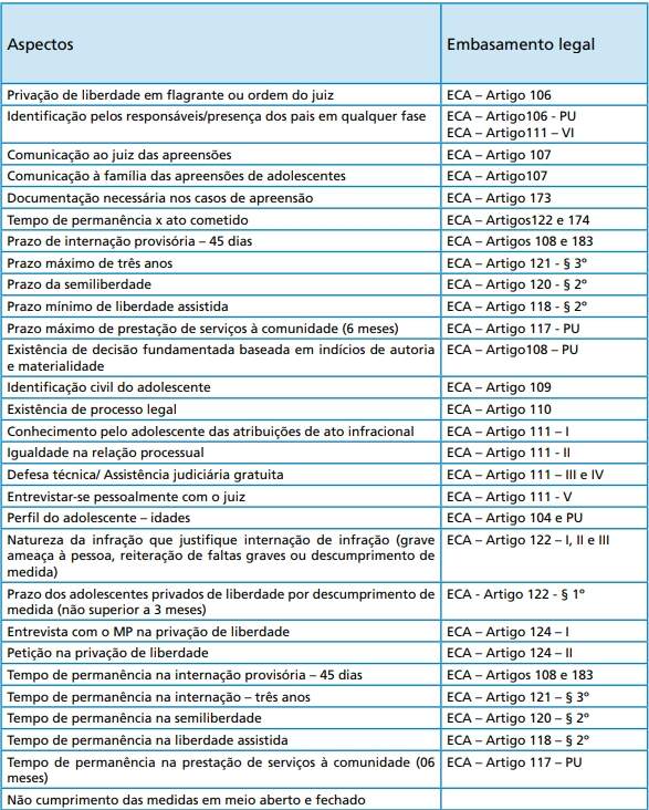 Respeito ao devido processo legal – artigos 227, § 3º, inciso IV da Constituição Federal, 40 da Convenção das Nações Unidas sobre os Direitos da Criança e 108, 110 e 111 do ECA e nos tratados internacionais: Observar rigorosamente o devido processo legal para o adolescente acusado de prática de ato infracional significa elevá-lo efetivamente à posição de sujeito de direitos. Nesse sentido, não pode haver outras considerações que não a defesa intransigente do direito de liberdade do adolescente no processo judicial de apuração de sua responsabilidade. O devido processo legal abarca, entre outros direitos e garantias, aqueles a seguir arrolados: fundamentação de toda e qualquer decisão realizada no curso do processo, entre elas a própria sentença que aplica uma medida socioeducativa, que deve se pautar em provas robustas de autoria e materialidade; presunção de inocência; direito ao contraditório (direito à acareação, juiz natural imparcial e igualdade de condições no processo); ampla defesa; direito ao silêncio; direito de não produzir provas contra si mesmo; defesa técnica por advogado em todas as fases, desde a apresentação ao Ministério Público; informação sobre seus direitos; identificação dos responsáveis pela sua apreensão; direito de ser ouvido pessoalmente pela autoridade competente; direito de ser acompanhado pelos pais ou responsáveis; assistência judiciária gratuita e duplo grau de jurisdição.