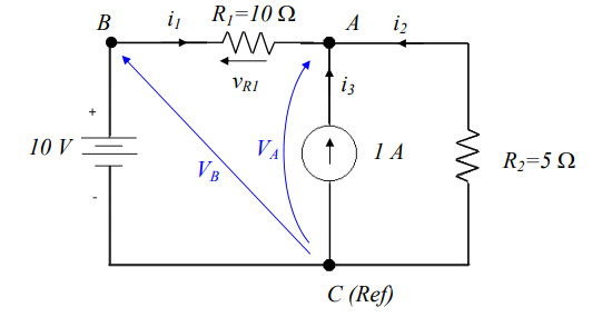 O método das tensões dos nós utiliza as denominadas tensões de nó. Tensões de nó são diferenças de potencial de todos os nós do circuito elétrico em relação a um nó eleito como referência. Desta forma, como no circuito exemplo existem apenas dois nós, elegendo o nó B como referência, vai existir apenas uma tensão de nó. Desta forma, haverá apenas uma equação a ser resolvida para se chegar à solução do circuito.