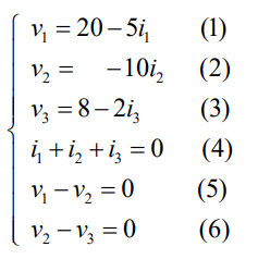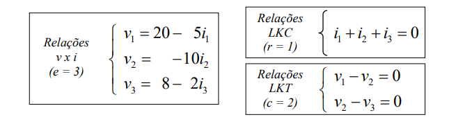 As relações v x i, juntamente com as relações LKC e as relações LKT perfazem as 6 relações necessárias para se resolver o circuito acima. Desta forma: