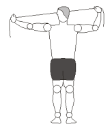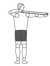 - Soltar a musculatura das costas: Usar uma borracha e segurar uma ponta com cada mão. Levantar um braço acima da cabeça e o outro braço à altura do ombro. Com o braço à altura do ombro puxe-o para baixo e segure por 10 segundos. Repita 6 vezes com cada braço.