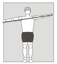 5. Esticar o braço lateralmente até ficar uma linha com as costas e a mão à altura do ombro. É importante observar que o corpo não incline para trás (compensação muscular por causa de falta de músculatura para segurar o elástico). Manter por 10 segundos.
