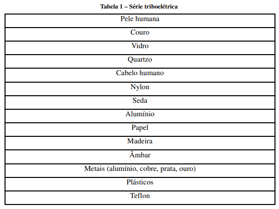 Quando dois corpos são atritados, os átomos mais externos de cada corpo entram em contato intenso e podem trocar carga elétrica, mesmo que um deles seja um isolante. Esse fenômeno é conhecido como efeito triboelétrico. Através de experimentos, foi descoberto, por exemplo, que o vidro ao ser atritado com lã sempre adquiria carga positiva, enquanto a lã sempre adquiria carga negativa. Dessa forma, foi possível construir a série triboelétrica mostrada a seguir. Quando dois corpos dessa lista são atritados, o que aparece primeiro ganhará carga positiva, enquanto o último ganhará carga negativa.