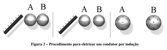 Se, em seguida, o condutor esférico da figura 1 for conectado a outro condutor, conforme ilustrado na figura 2, haverá uma migração de cargas negativas (elétrons) do segundo condutor (condutor B) para o primeiro (condutor A). Se o bastão for afastado, os condutores voltam a ficar neutros. Entretanto, se a conexão entre eles for cortada antes disso, as cargas não podem mais se transferir de um para outro: o primeiro adquiriu uma carga negativa permanente e o segundo uma carga positiva permanente. Esse processo está mostrado na figura 2.