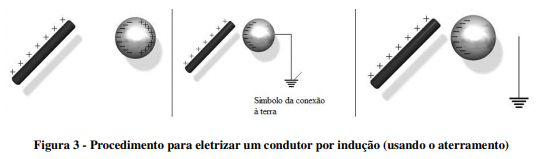 Na prática, o segundo condutor pode ser substituído por uma conexão com a terra (aterramento), que pode ser considerada um condutor infinitamente grande que está sempre neutro. Ao fazer isso, há uma migração de cargas negativas da terra para o condutor, deixando-o com carga negativa. Assim, se conexão à terra for interrompida ainda na presença do bastão o condutor adquirirá permanentemente uma carga negativa. Esse processo é mostrado na figura 3.