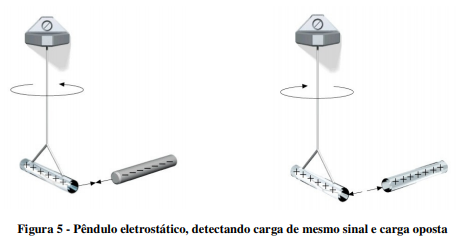Outro arranjo usado para detectar carga elétrica é o pêndulo eletrostático, que consiste de um bastão carregado (com carga de sinal conhecido) pendurado por um fio ou barbante, como na figura 5. Se a carga desconhecida é de mesmo sinal, o bastão irá se afastar; se for do sinal oposto, irá se aproximar.