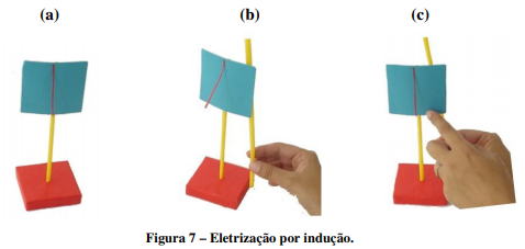 c) Atrite um canudo com papel higiênico e aproxime o canudo da parte de trás da cartolina (parte onde não estão as fitas). Mantendo o canudo aí, encoste o dedo na parte da frente da cartolina.