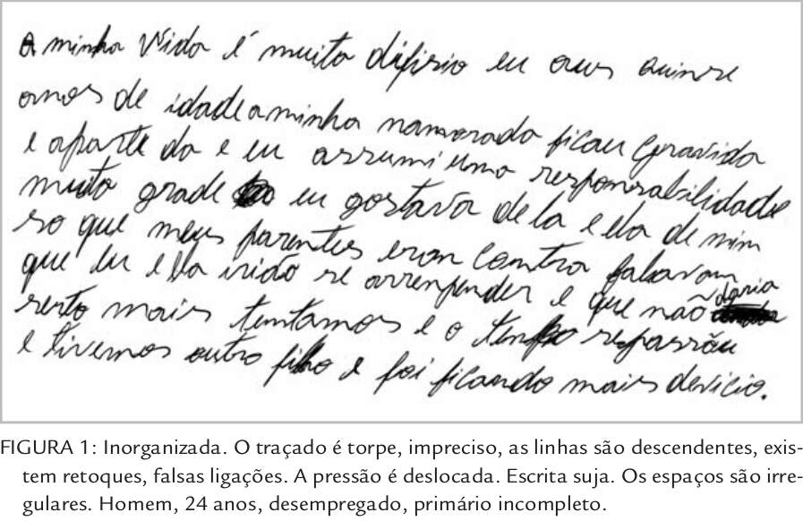Resultado da cultura gráfica insuficiente, doenças ou acidentes, essa escrita apre- senta grafismo torpe, com formas infantis, torcidas, grosseiras etc. O modelo caligráfico e a organização espacial do campo gráfico estão sempre comprometidos. Pratica- mente não existe direção das linhas e é possível que a pessoa escreva com a folha colocada no sentido horizontal. O tamanho das palavras não tem constância e quase todos os gêneros gráficos revelam, por assim dizer, problemas. A escrita inorganizada é comum em crianças com dificuldades de aprendizado, problemas familiares, entre outros. Em idosos, pode ser notada a deterioração gráfica. Ao observar tais escritas, o grafólogo precisa conhecer as causas dessa falta de organização, que muitas vezes tem origem em fatores exteriores ao indivíduo. A interpretação é ampla: insegurança, imaturidade, doenças, timidez, falta de atenção, vulgaridade, ignorância etc.