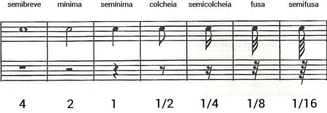 Os valores que representam a duração dos sons musicais são chamados de Figuras. Os que representam as ausências de sons são chamados de Pausas.