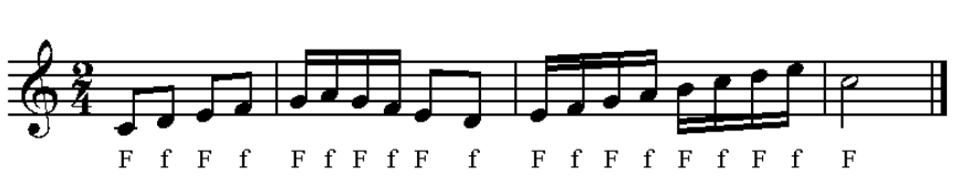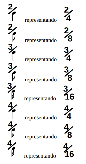Deduz-se o seguinte: Nesta fração 2/4 o numerador 2 indica o número de tempos. Trata-se de um compasso de dois tempos, isto é, Binário.O denominador 4 determina para unidade de tempo a figura que representa a 4ª parte da semibreve, ou seja, a semínima.