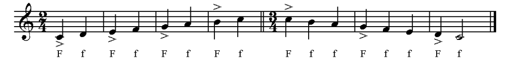 Para acentuar o som de uma determinada nota coloca-se sobre a mesma o sinal ^, > ou - .