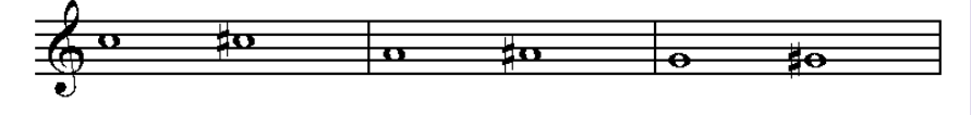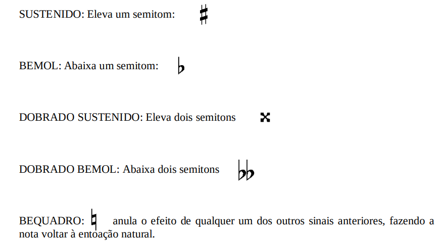 A entoação das notas, conforme o sinal de alteração, poderá ser elevada ou abaixada em um ou dois semitons. São os seguintes: