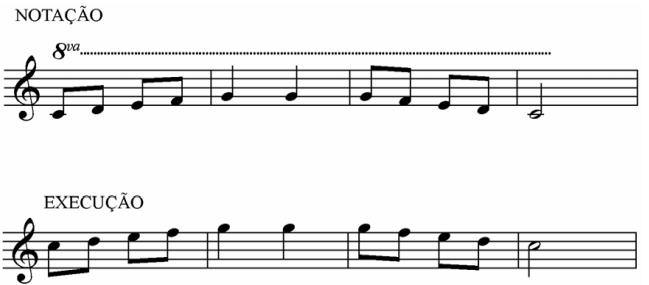 A linha de oitava (8ª........), quando colocada acima ou abaixo de uma nota ou de um grupo de notas, indica que as mesmas devem ser executadas respectivamente uma oitava acima ou abaixo.