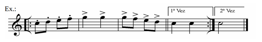 Expressões 1ª e 2ª vez:Quando um trecho a se repetir não deve terminar perfeitamente igual na 2ª vez, usa-se colocar sobre os compassos que deverão ser modificados as expressões 1ª vez e 2ª vez.