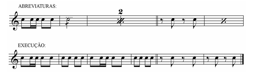 Há vários sinais usados para representar a repetição de notas ou de desenhos melódicos. Esses sinais são chamados Abreviaturas. As principais abreviaturas usadas são: