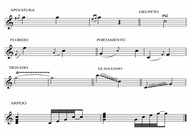 Apojatura – Arpejo – Glissando – Trinado – Mordente – Floreio Grupetto – Portamento – Cadência melódica.