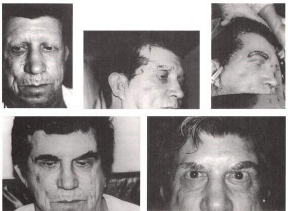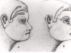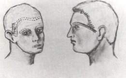 O retalho em viseira de GONZALEZ - ULLOA utiliza o mesmo princípio de Erich, sendo um retalho que contém a artéria temporal superficial. Sua modificação consiste no uso de um retalho único bi-pediculado, que desce sobre a zona receptora como a viseira de um elmo(Fig. 15.3). A porção cruenta da zona doadora é enxertada temporariamente. Ao fim de 22 dias os pedículos retornam ao seus locais de origem, deixando na região supraciliar, de ambos os lados, a quantidade de pele necessária à reconstrução das sobrancelhas. Posteriormente, o mesmo autor elaborou um outro procedimento, chamado retalho frontal, onde utiliza dois retalhos separados, nutridos por ramos frontais da artéria temporal, e desenhados próximo à linha de implantação dos cabelos na região frontal. A técnica mais utilizada em relação aos retalhos a distância é a do retalho em ilha