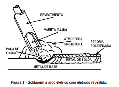 A soldagem a arco elétrico com eletrodo revestido (Shielded Metal Arc Welding – SMAW), também conhecida como soldagem manual a arco elétrico, é o mais largamente empregado dos vários processos de soldagem. A soldagem é realizada com o calor de um arco elétrico mantido entre a extremidade de um eletrodo metálico revestido e a peça de trabalho (veja a Figura 1). O calor produzido pelo arco funde o metal de base, a alma do eletrodo e o revestimento. Quando as gotas de metal fundido são transferidas através do arco para a poça de fusão, são protegidas da atmosfera pelos gases produzidos durante a decomposição do revestimento. A escória líquida flutua em direção à superfície da poça de fusão, onde protege o metal de solda da atmosfera durante a solidificação. Outras funções do revestimento são proporcionar estabilidade ao arco e controlar a forma do cordão de solda.