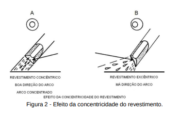 A concentração e a direção do fluxo do arco é conseguida obtendo-se uma cratera no revestimento algo parecida com o bico de uma mangueira d'água, dirigindo o fluxo do metal de solda. Quando o revestimento não estiver concêntrico com a alma metálica, pode causar a condição B da Figura 2. A má direção do arco ocasiona cordões de solda inconsistentes, proteção deficiente e falta de penetração. O eletrodo queima de modo irregular, deixando uma projeção no lado onde o revestimento é mais espesso. Essa condição é conhecida como unha.