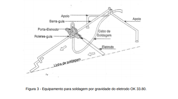 Os eletrodos de altíssimo rendimento possuem uma aplicação com altas taxas de deposição, que é a soldagem por gravidade em estaleiros navais com o dispositivo (tripé) mostrado na Figura 3.