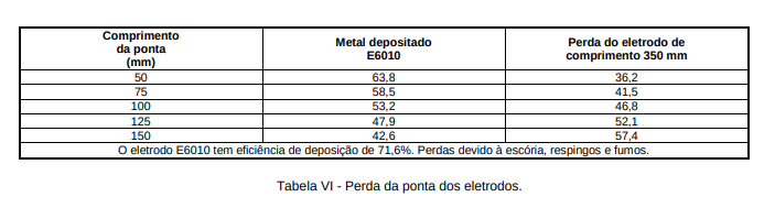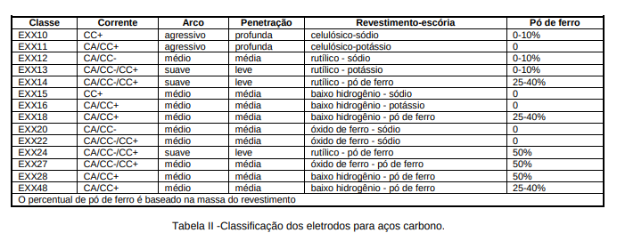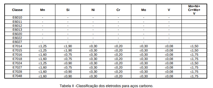 A Tabela III mostra os requisitos químicos para eletrodos revestidos aplicáveis aos aços carbono.