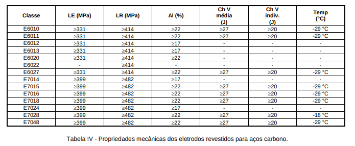 A Tabela IV mostra as propriedades mecânicas para os eletrodos revestidos aplicáveis aos aços carbono.
