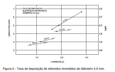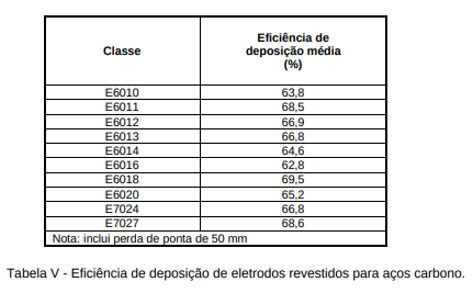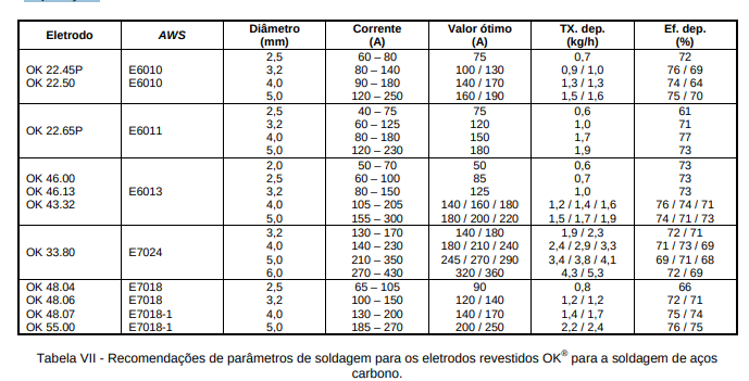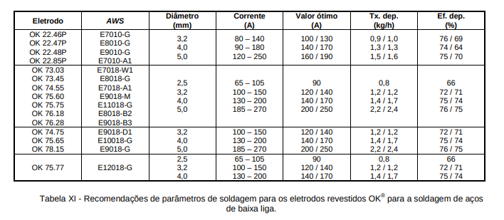 A Tabela XI mostra os parâmetros de soldagem recomendados para a soldagem com eletrodos revestidos OK® para aços de baixa liga e suas respectivas taxas de deposição e eficiências de deposição