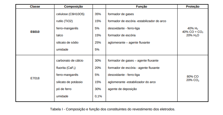 A Tabela I mostra alguns constituintes típicos dos revestimentos e suas funções para dois tipos de eletrodos para aços carbono. Observe que o teor de umidade no eletrodo celulósico E6010 é muito maior que o do tipo de baixo hidrogênio E7018. A umidade no revestimento do eletrodo E6010 é necessária para produzir as características de atuação do arco e não é prejudicial na soldagem de aços de baixa resistência, visto que a agitação promovida na poça de fusão é muito intensa e permite a liberação de boa parte do hidrogênio. O hidrogênio pode causar problemas na soldagem de aços de alta resistência.