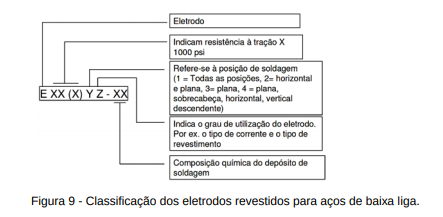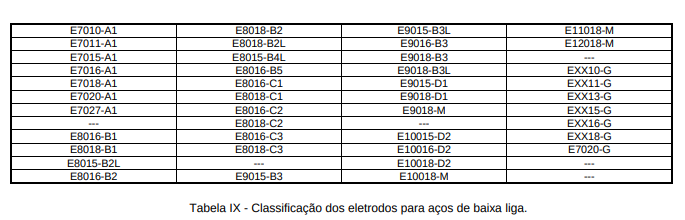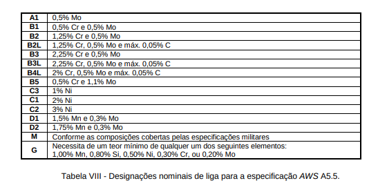 Deve ser observado que a especificação AWS A5.5 cobre não somente os eletrodos de baixa liga e baixo hidrogênio, como também todas as versões de eletrodos do tipo celulósicos, com adições de titanato e de pó de ferro. O significado das designações da AWS está na Figura 9. Uma lista completa de todos os eletrodos cobertos por essa especificação é mostrada na Tabela IX