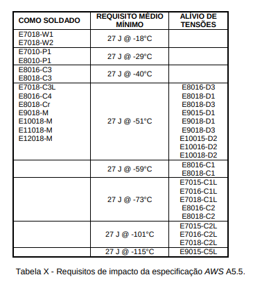 Levando em consideração que muitos dos aços de baixa liga são desenvolvidos para serviço a baixa temperatura, as propriedades de impacto do metal de solda selecionado para unir esses aços são muito importantes. Exceto para os tipos já mencionados no item anterior, todos os ensaios de impacto são realizados em corpos de prova que tenham sofrido alívio de tensões. A Tabela X estabelece os requisitos mínimos de valores de energia para os corpos de prova do tipo Charpy-V em conformidade com a especificação AWS A5.5.