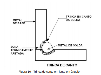 Durante a soldagem de juntas em ângulo em aços de alta resistência temperados e revenidos, frequentemente ocorrem trincas de canto ao longo dos cordões de solda (veja a Figura 10). A trinca de canto ocorre na zona termicamente afetada durante a contração do metal de solda porque este apresenta limites de escoamento e de resistência maiores que os do metal de base. A solução para esse problema é usar um eletrodo que produza um metal de solda de escoamento e resistência menores e aumentar o tamanho da perna para atender aos requisitos de resistência mecânica da junta soldada.