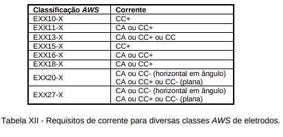 O eletrodo escolhido funcionará apenas com a fonte apropriada. A Tabela XII relaciona o tipo de corrente para o qual cada eletrodo foi desenvolvido.