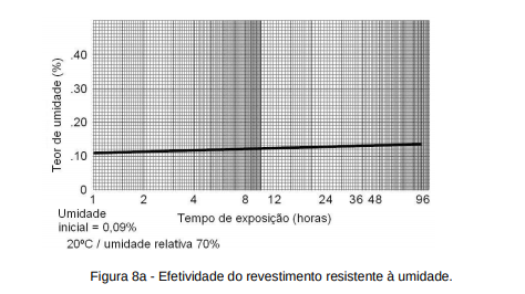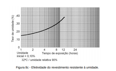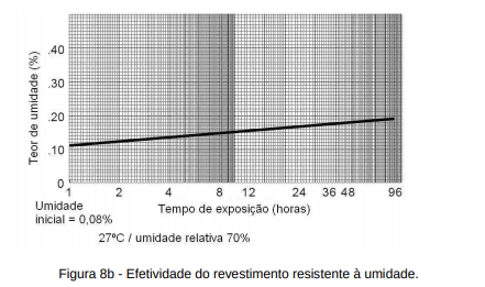 Os gráficos mostrados na Figura 8a, na Figura 8b e na Figura 8c dão uma idéia da efetividade de um revestimento resistente à umidade. O método escolhido para a realização desses testes está descrito na especificação AWS A5.5. Ele foi escolhido porque satisfaz às especificações AWS e é sensível apenas à água, tornando-o um dos mais precisos e confiáveis métodos de determinação de umidade atualmente em uso.