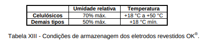 As condições de armazenagem recomendadas para os eletrodos revestidos OK® podem ser observadas na Tabela XIII.