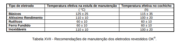 A Tabela XVII apresenta a faixa de temperatura efetiva na estufa de manutenção e na estufa portátil (cochicho) recomendadas para os eletrodos revestidos OK® .