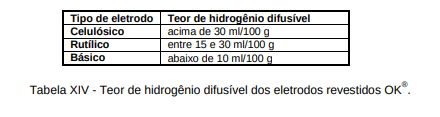 Os teores de hidrogênio difusível para os diversos tipos de eletrodos revestidos OK® podem ser vistos na Tabela XIV.