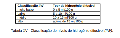 O International Institute of Welding (IIW) classifica os teores de hidrogênio difusível nos diversos níveis exibidos na Tabela XV.