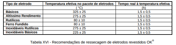 A Tabela XVI mostra a faixa de temperatura efetiva e o período de tempo real recomendado para a ressecagem de eletrodos revestidos OK®.